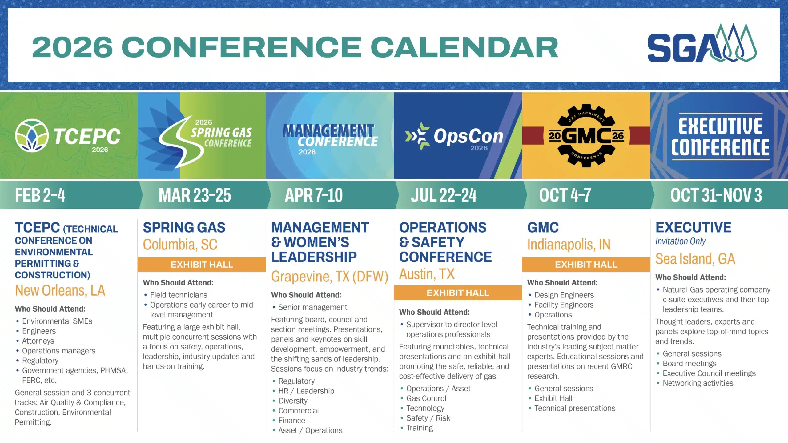 To support our mission and the industry’s continued growth, we are actively seeking corporate partners and sponsors for our 2025 conferences and leadership programs. Our past sponsors have seen outstanding engagement and visibility, and we’re excited to offer even more impactful opportunities for you to connect with decision-makers and shape the future of natural gas. View the 2025 Sponsor Brochure here or contact Tina Hamlin at thamlin@sganaturalgas.org to take advantage of the numerous upcoming sponsorship opportunities with SGA.